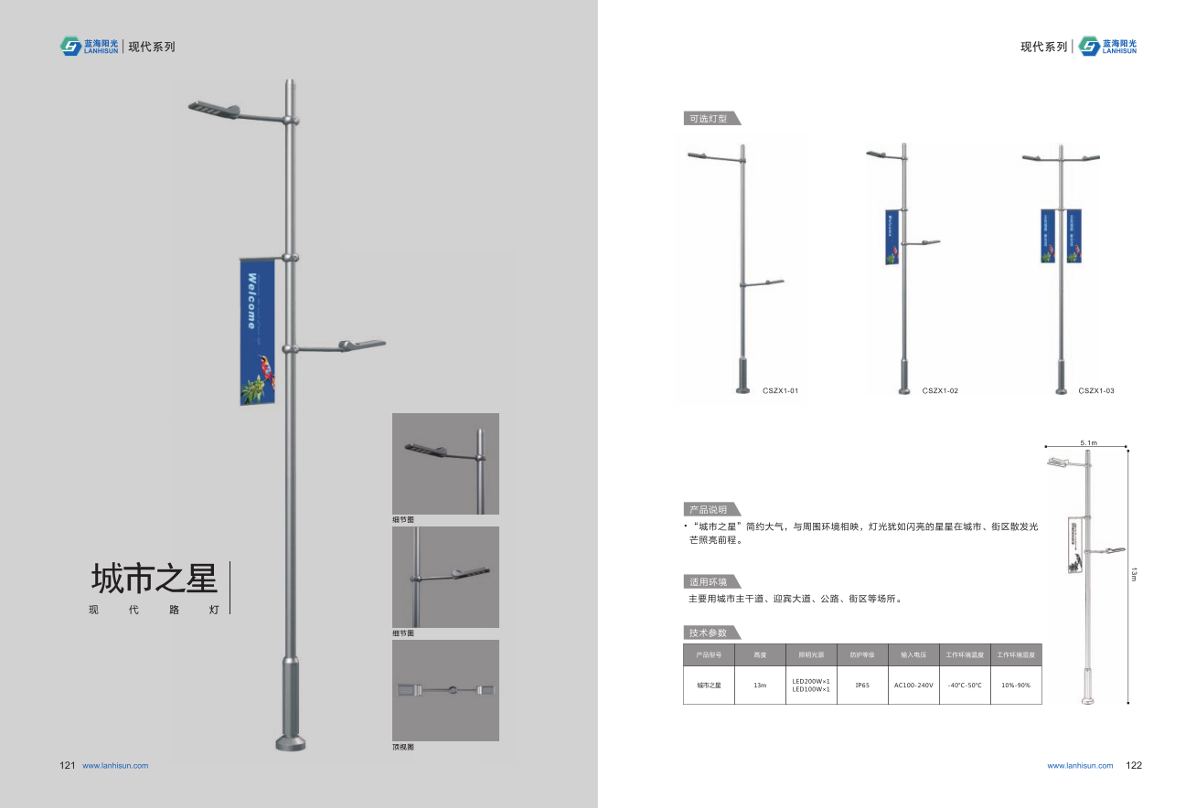 1、高度為6-16米; 2、光源為2組LED光源,色溫2500-6500K,每個光源功率為60-300W; 3、LED驅動電源壽命可達五年; 4、整體熱鍍鋅噴塑,保證燈桿15年不生銹; 5、可以根據使用地區的地域文化、產業特點等進行文化定制;